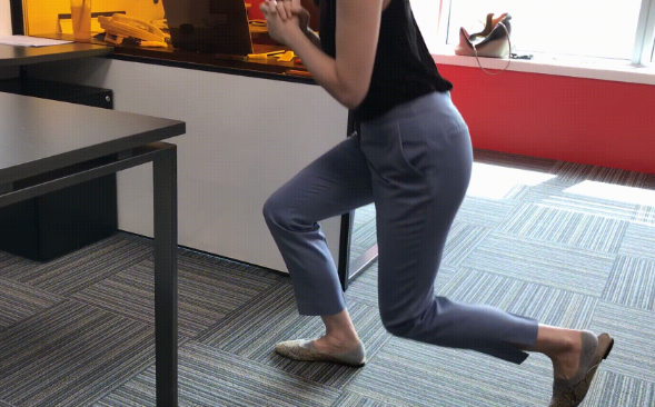 采站姿,双手交握放置胸前,双脚打开略与肩宽,单脚往后跨一步,保持背部挺直。吸气预备,双脚慢慢下蹲,直到大腿与小腿约呈90度,吐气时,腿部发力撑起身体,重复动作,感觉腿部酸酸的就能换边训练。