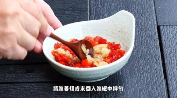 2、将泡姜切成末倒入泡椒中拌匀,倒入泡姜的卤汁。