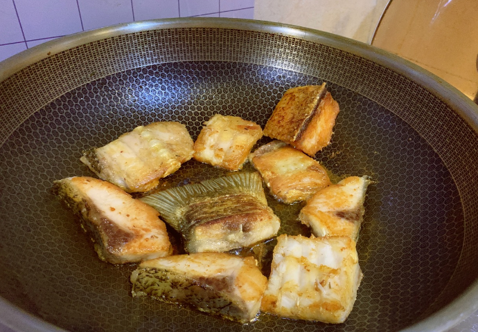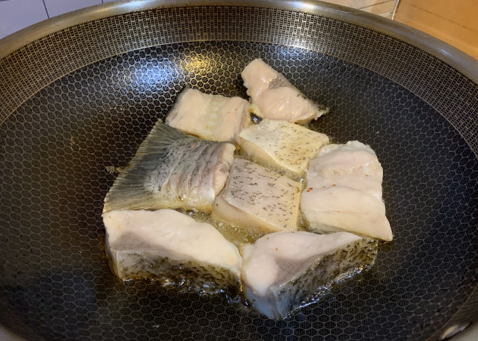 3、加油放入姜片爆香捞出姜片,放入鲳鳊鱼。煎黄一面后关火,冷锅后翻面。