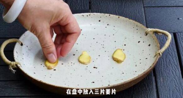 4、然后在盘中放入三片生姜,放入鲳鳊鱼。