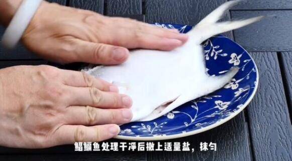3、将鲳鳊鱼处理干净后,撒适量盐抹匀。
