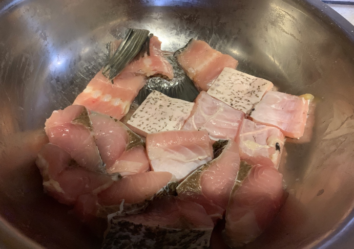 2、鲳鳊鱼切块用盐腌制20分钟以上。