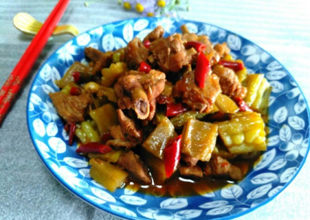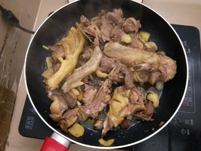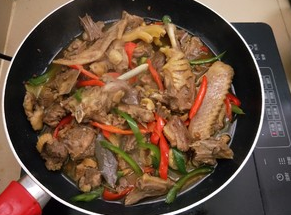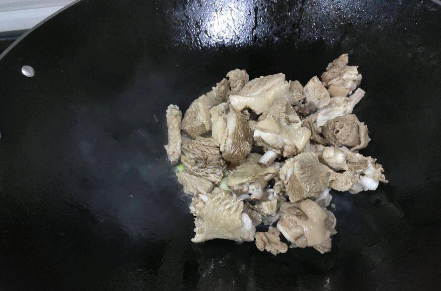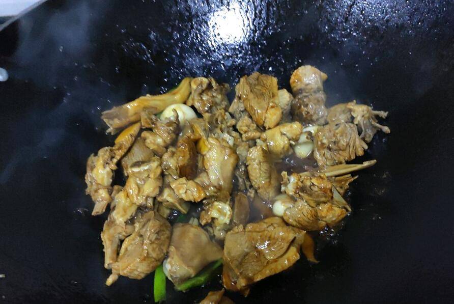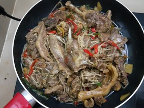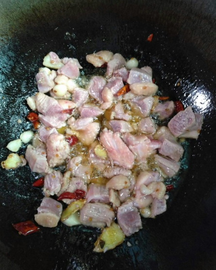 3、锅中倒油炒姜蒜辣椒,倒入鸭子炒。