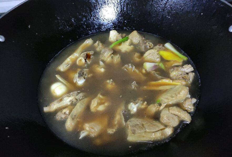 3、爆香花椒和八角,捞出丢弃。爆香葱、姜、蒜,倒入鸭肉。