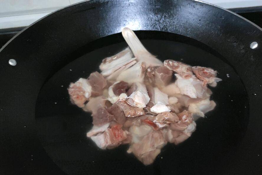 2、鸭子洗干净斩件,放锅里加入适量水和姜片,大火煮开煮5分钟,洗干净备用。
