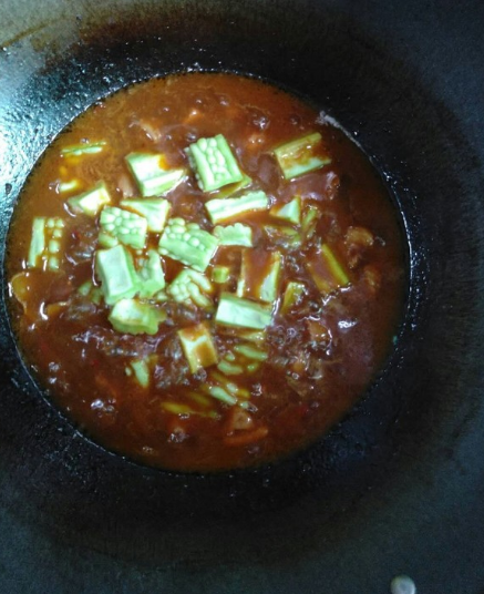4、加豆瓣酱油炒香,加一碗水烧软入味,加苦瓜烧入味。