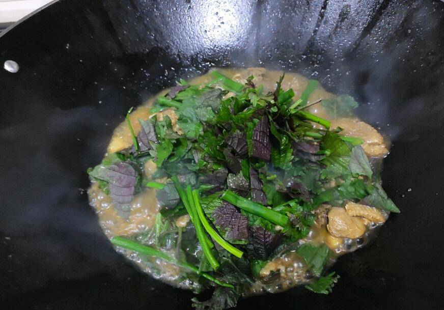 6、加入紫苏和葱段,适量盐翻炒均匀即可。