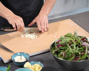 2、将红苋菜洗干净,根部摘掉,大蒜切成末备用。