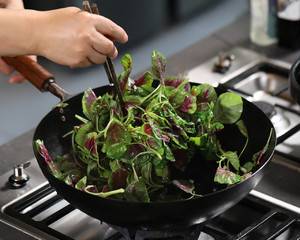 4、再将准备好的红苋菜倒进去,放一勺盐,翻炒一分钟左右即可。