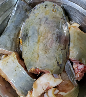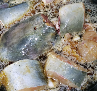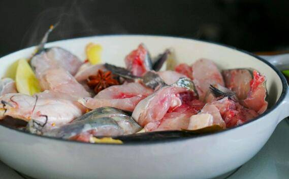 清江鱼肢解后加葱姜蒜、酒,盐腌制20分钟左右。