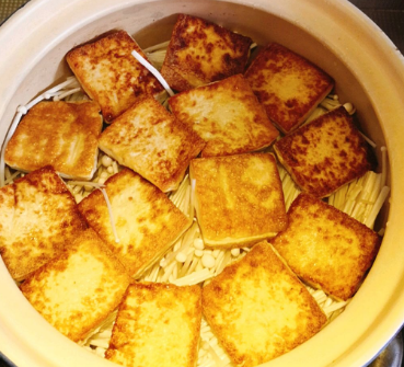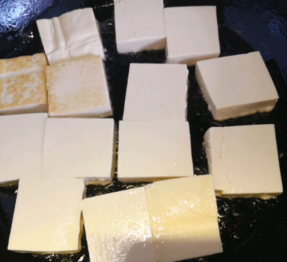 豆腐切块,热锅放油,放豆腐煎到两面金黄。