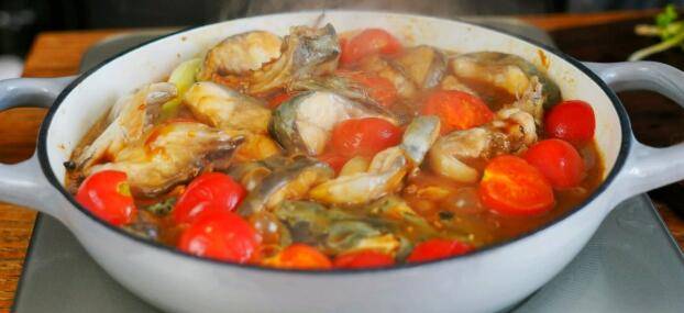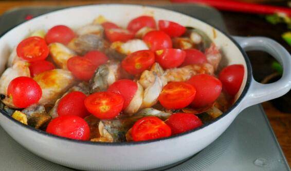 看到汁水渗出鱼还没有熟,放西红柿还是中火再炖5分钟。