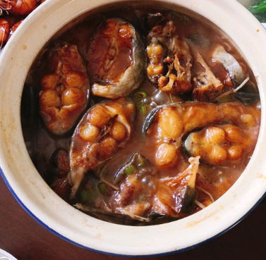 二、清炖清江鱼:清江鱼一条1200克、葱姜蒜适量、冰糖6小块、米醋适量、八角适量、花椒适量、鸡精少许、盐适量、生抽2勺、老抽1勺。
