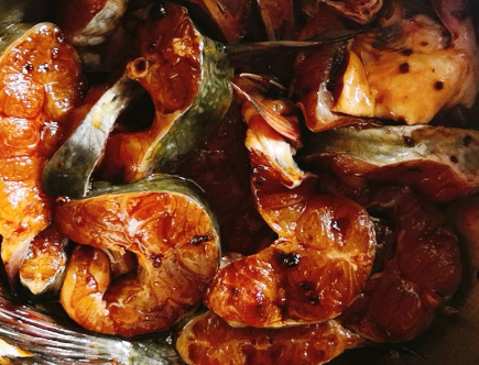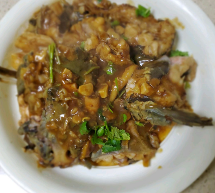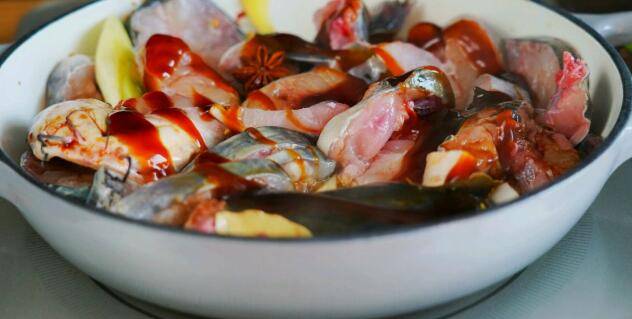 鱼洗净切段,加入一勺盐,一勺料酒,一勺老干妈,一勺老抽,一勺蚝油,两勺生抽抓拌均匀,腌制半小时以上。