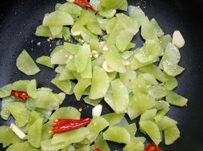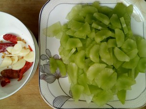 二、清炒笋片。准备食材: 莴笋1根、蒜2瓣、干红椒3个。