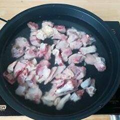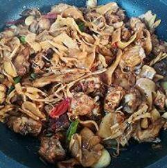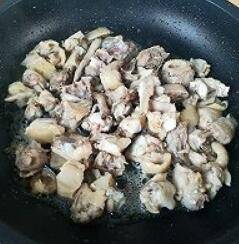 2、锅里放油放入鸡肉翻炒到微微焦黄。