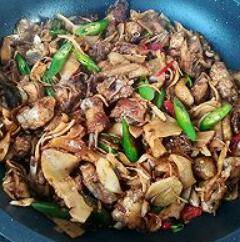 一、鸡肉炒笋片。准备食材:鸡肉1斤、笋片300克、二荆条辣椒4个、红辣椒3个、大蒜5瓣、生姜1块、炒鸡酱半罐、食用油适量。