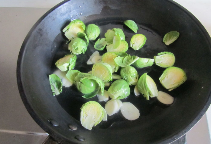 三、笋片炒抱子甘蓝。准备食材:冬笋1个、抱子甘蓝1小碗、蒜3瓣、枸杞5-8颗、糖1勺、油盐适量。