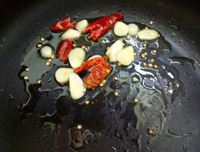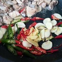 3、鸡肉推到一边,放入蒜片、姜片、一半辣椒翻炒出香味。