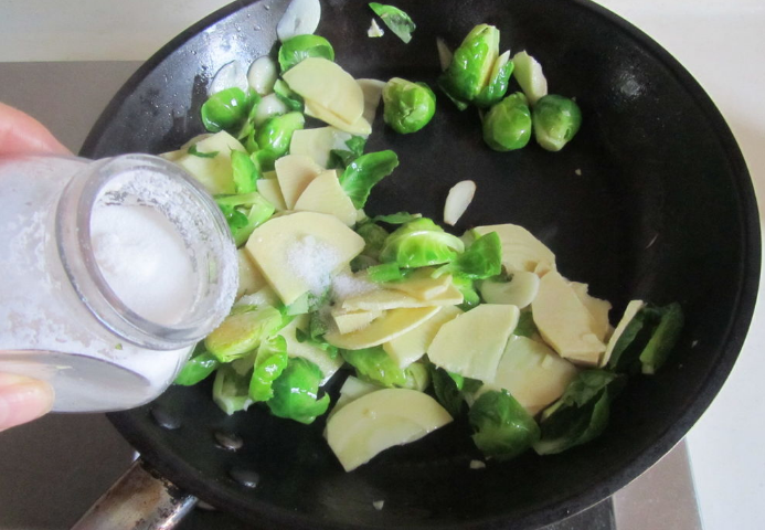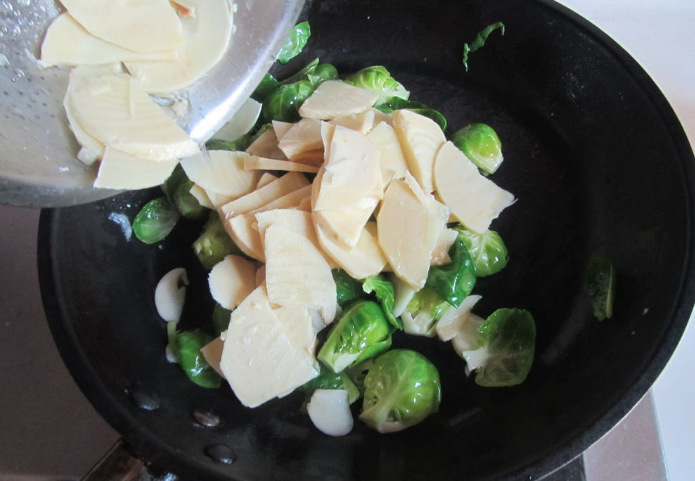 4、抱子甘蓝翻炒变色后加入焯过水的冬笋片进去翻炒。