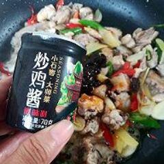 4、倒入半罐炒鸡酱调味料翻炒上色。