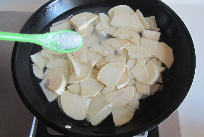1、冬笋切片后放入锅中焯水,加入少许糖和盐,焯煮两分钟后捞出。