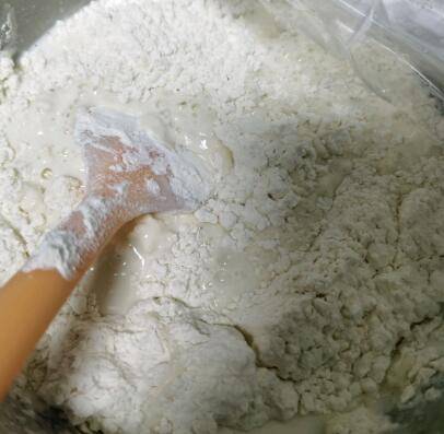 4、加入酵母和糖搅拌均匀,加入面粉,搅拌均匀。可以分三次倒入,有利于充分搅拌均匀。