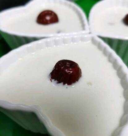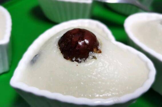 5、搅拌好的米面糊呈酸奶状,拿出准备好的容器,可以用小碗炖盅等甜品容器、也可以用烘焙用的小蛋糕模具。可以薄薄的刷一层油,把米糊倒入到七分满。把红枣拦腰扭断后插入碗中,这样红枣的香气和味道可以在蒸煮中融入米糕。也可以用葡萄干、蓝莓干等干果替换红枣,视个人喜好。