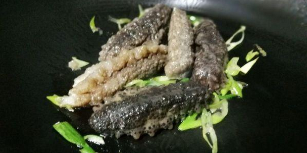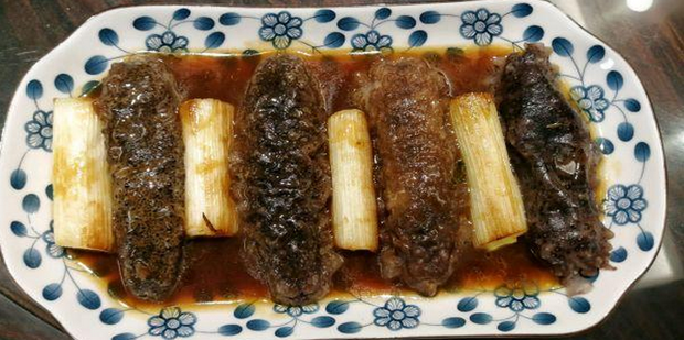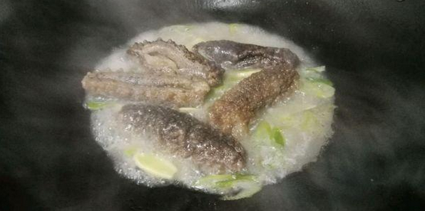 5:把煮透的海参捞出放入盘子,和刚才捞出的葱段间隔摆盘。在锅里倒入少许的蚝油、糖、盐调匀,最后倒入少许生粉勾芡的生粉水收汁,倒入摆好的海参上边即可。