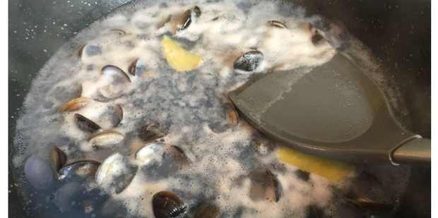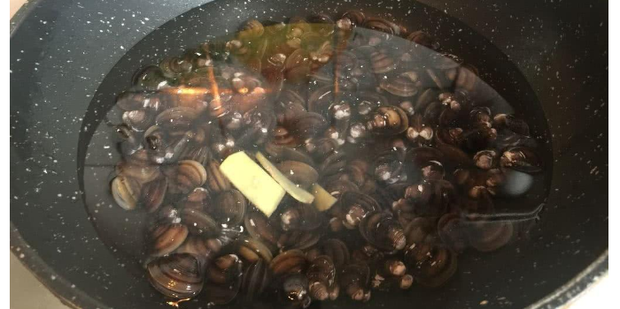 同术距角3:开大火煮,煮的过程会有很多泡泡,这个时候用锅瓢把这些泡泡给清理出去,直到蚬子都煮开口。