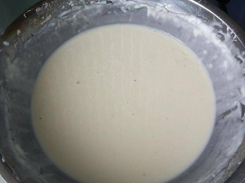1、把面粉和淀粉水和在一起,调成淀粉糊,把切好的茄子均匀的包裹上淀粉糊。