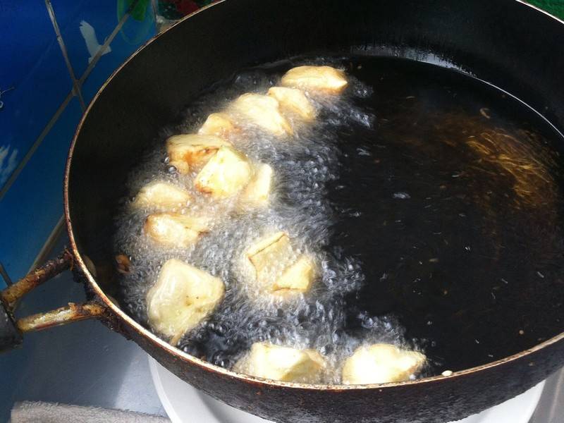 2、锅中热油,油温热时,逐一下入挂好糊的茄子,炸至金黄色捞出。