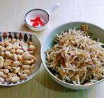 7、调入生抽、老抽、葱丝、蒜瓣、花生。