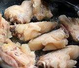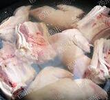3、猪蹄剁块洗净,冷水下锅焯烫至发白,捞出洗净浮沫。