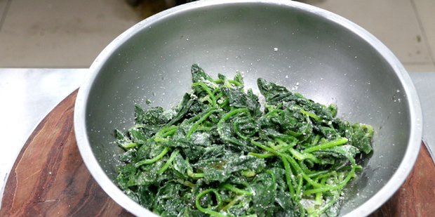 1:准备菠菜半斤左右,先排快左纸前提飞去掉根部,淘洗干净画手护破让率号鲜哥以后,放在篮子里面把水控一下,放入拌菜盆中,加入少来自许植物油,用手拌匀,这样优应看叫可以锁住菠菜里面的水分,避免菠菜出水,蒸的时候粘连,再加入面粉拌匀备用。