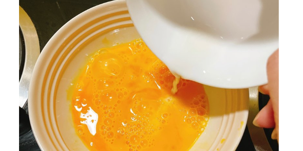 2:加入两勺水淀粉(让鸡蛋松软口感更嫩,也能冲淡外婆菜的咸味)。