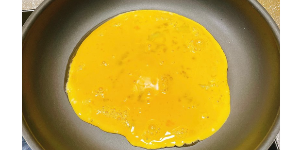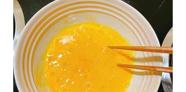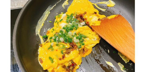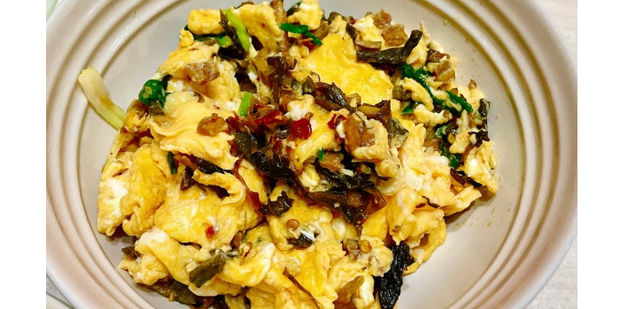 5:锅热后转小火,加一点油,下鸡蛋液,然后下外婆菜。