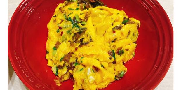 6:沿着锅边慢慢翻炒鸡蛋,撒上葱花。