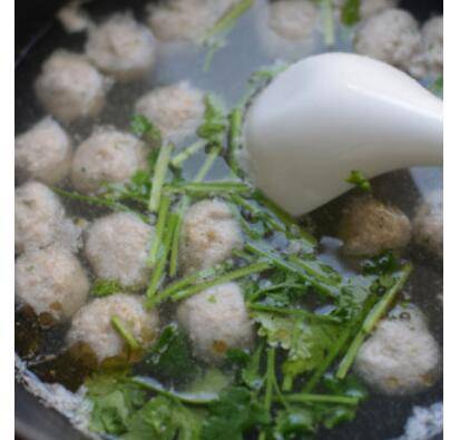7、撇净浮沫,加入盐、胡椒粉、鸡精、香油调味,点几滴香醋,撒上香菜。