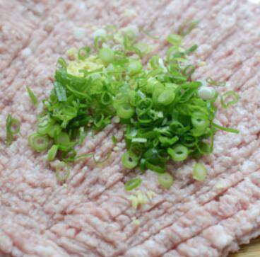 2、将猪肉切成小粒,用刀剁碎,加上切好的葱花和姜末,接着剁。