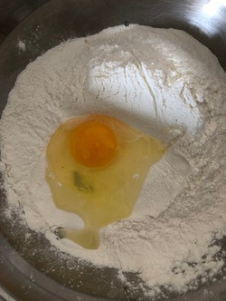 2:面粉中加入盐和一个鸡蛋,搅拌成絮状,再把混合好的牛奶倒入,继续搅拌,再加入食用油,用的是橄榄油,接下来就是最辛苦的揉硫展热面团了