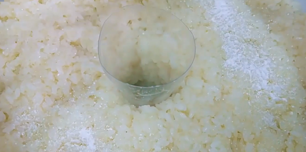 6:再把一个底的矿泉水瓶放入洞中,这样等发酵好的非常清楚,再糯米饭上和洞中均匀的撒上一层酒曲