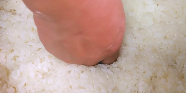 5:把压碎的甜酒曲均匀的撒在糯米饭上,然后用手搅拌均匀,保证酒曲均匀的拌再糯米饭中,再用手压紧实,再在缸中挖一个到缸底的圆洞