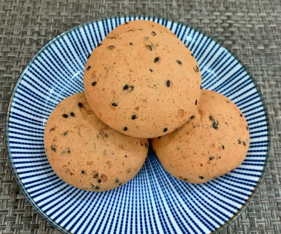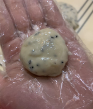 8:加入5克左右的黑芝麻,揉均匀(面团很沾手,建议用硅胶揉面垫和戴上手套操作)