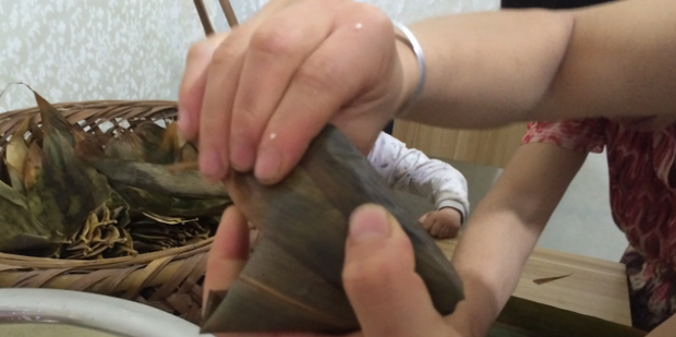 5:如何包裹粽子:将3-4层叶子放在一起,小心地将底部折叠成锥形。用手握住底部的叶满底部,然后加入肉。用更多的米饭盖住肉。向下折叠芦苇叶并调整以覆盖所有馅。