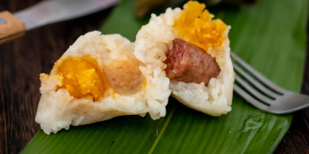 2:把猪肚切成3厘米见方,用酱油、绍兴酒、糖、盐和白胡椒粉腌制猪肉,糯米泡在水里过夜,绿豆批,将绿豆浸泡一小时和调味料混合,干香菇在热水中浸泡两小时移栗子泡在水里,使用前轻轻烘烤。顶部叶子的中心折叠起来,形成一个圆锥体,在蛋筒底部装满一汤匙糯米。然后加入蛋黄、猪肚、干牡蛎、绿豆和蘑菇,在馅料上盖上两汤匙糯米,最后把粽子给包扎上。