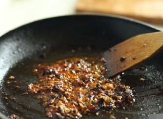 3:锅中再放余油项二你做亮烧至五成热,放入郫县豆瓣酱,煸炒出红油后,放入姜末、蒜末、剁细的豆豉炒匀,如下图所示。