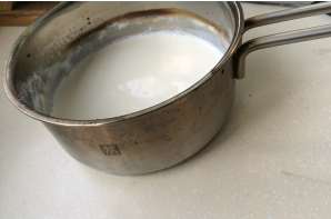 谁府日1:把牛奶一边加热一来自边搅拌,快沸腾时关火冷却一旁。