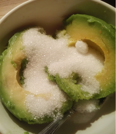 5:配砂糖。挑一个熟软的牛油果,对半切开,取走果核,用小叉子或小勺将果肉从皮上刮下来碾碎,放入白砂糖一勺拌匀,直接用勺子舀着吃。