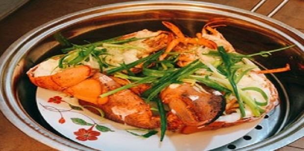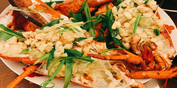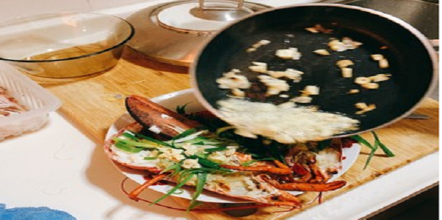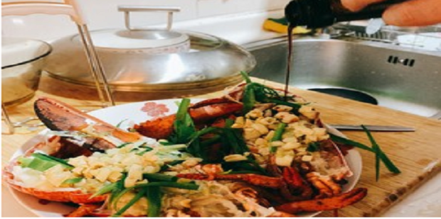 6:爆过的油和蒜撒在蒸好的龙虾上